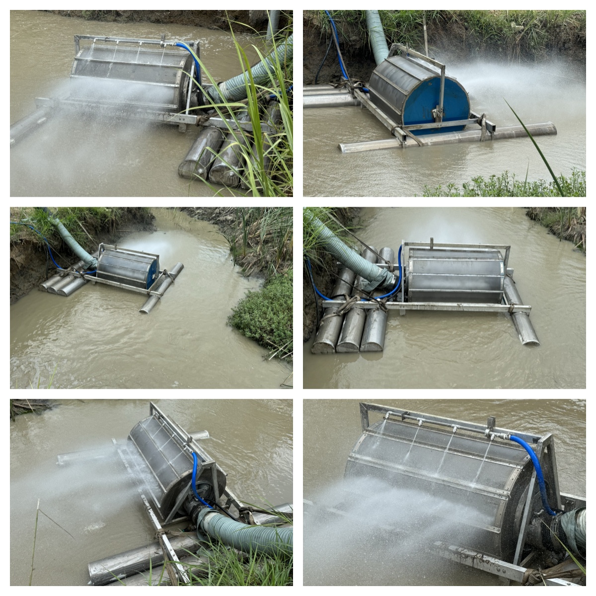 Agrify Waterscreen is the ideal solution for any operation that depends on a water supply containing suspended debris. The water intake port is surrounded by a rotating drum-shaped screen. A lightweight aluminium frame and pontoon provides flotation for the unit. The stainless steel rotating screen is self-cleaning, with a row of spray nozzles mounted inside the drum spraying water outwards through the 304 stainless steel #8 mesh screen. The cleaning nozzles are setup to spray downstream to ensure debris floats away from the Waterscreen, this highly effective system ensures that the screen remains clean around the water intake port.